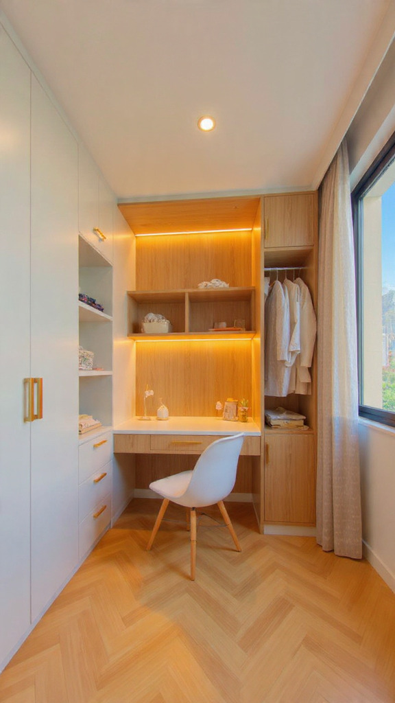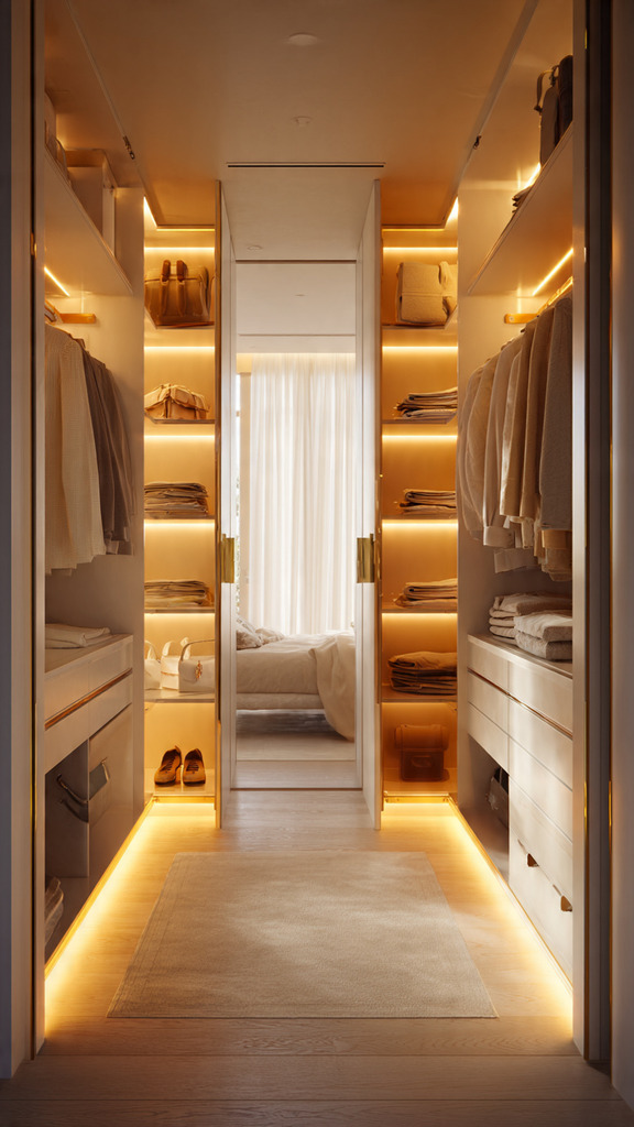 LED lights are cool because they don’t get hot and use little electricity. Warm white lights (2700-3000K) create a cozy feel. Cool white (4000-5000K) helps match colors when picking outfits. Smart lighting systems with dimming and motion sensors add luxury without costing too much.