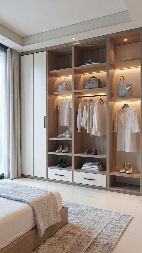 Open shelves are not just for looks. They let you see your clothes and accessories easily. You can display handbags, shoes, and sweaters on them. Baskets and containers keep things tidy and add texture.