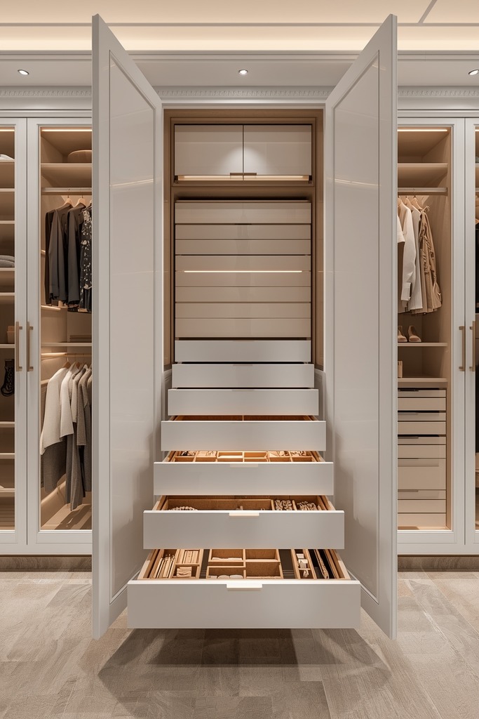 Think about adding special drawers for extra use. Velvet-lined drawers keep jewelry tidy. Drawer dividers for ties and belts help prevent wrinkles. Pull out trays make it easy to find what you need without digging through drawers.