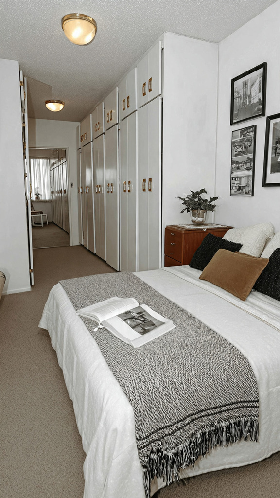 Open shelving makes small bedrooms feel bigger by breaking up solid walls. Mixing it with closed storage makes rooms feel lighter. This mix is great for modern, minimalist designs. It adds interest and keeps the room looking clean and simple.