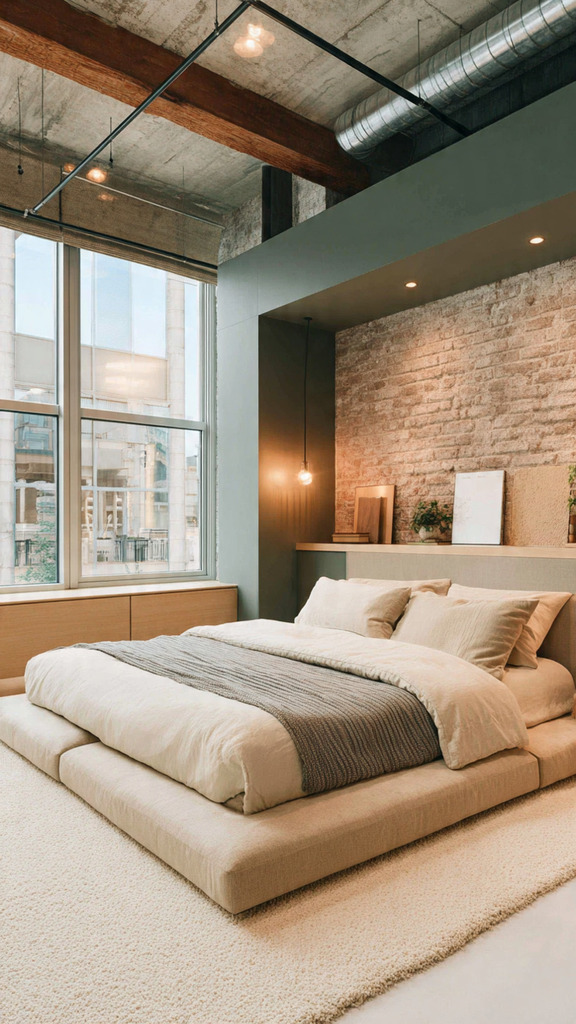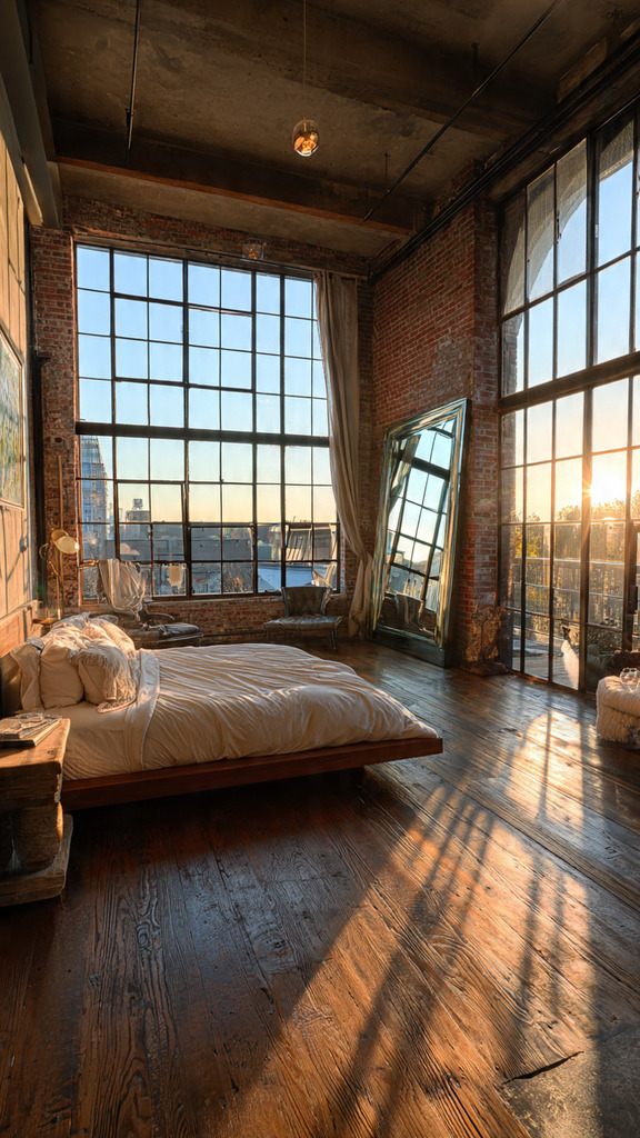 The mix of factory style windows and mirrors boosts light and looks good in your industrial loft bedroom. This makes your room feel brighter and more open, balancing out the industrial look.