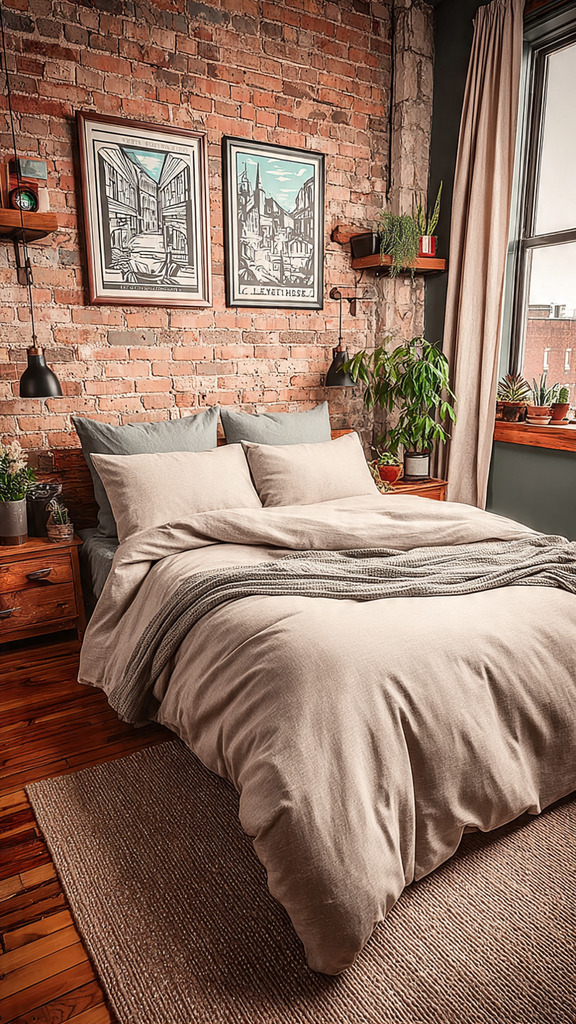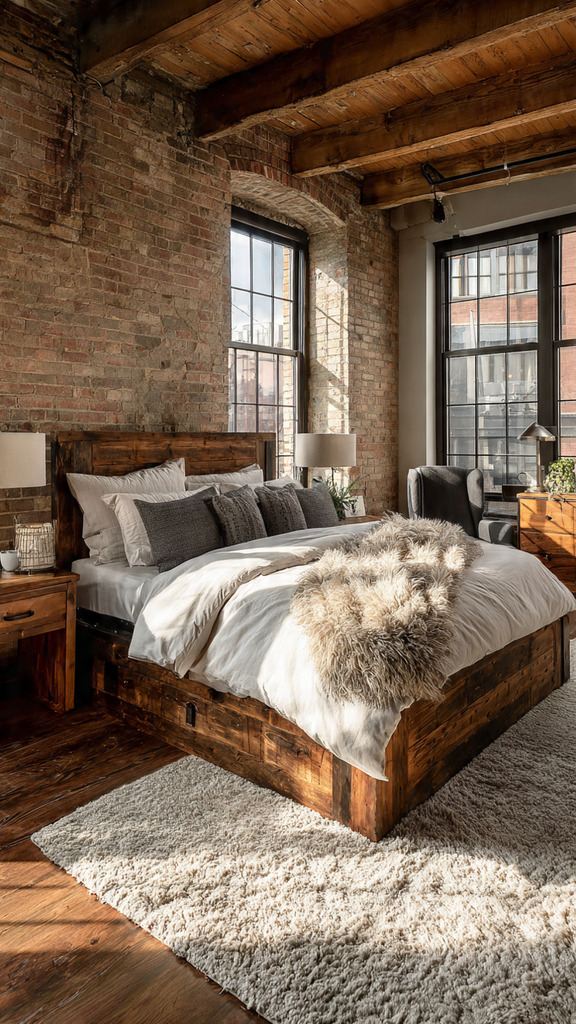 Exposed brick walls add a cool edge to industrial bedroom decor. Yet, they can feel a bit harsh. To make your bedroom a cozy haven, it’s key to mix the brick’s raw charm with soft, warm elements.