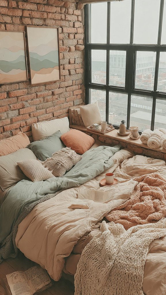 Layering different textures and fabrics makes your space cozy and inviting. It softens the brick’s roughness. This not only adds beauty but also makes your room feel more welcoming and calm.