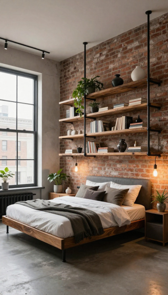 Open pipe shelving is great for industrial loft bedrooms. It helps keep the room feeling open and airy. You can show off decorations or store books, adding your personal touch. This way, you can reach your items easily while keeping your space simple.