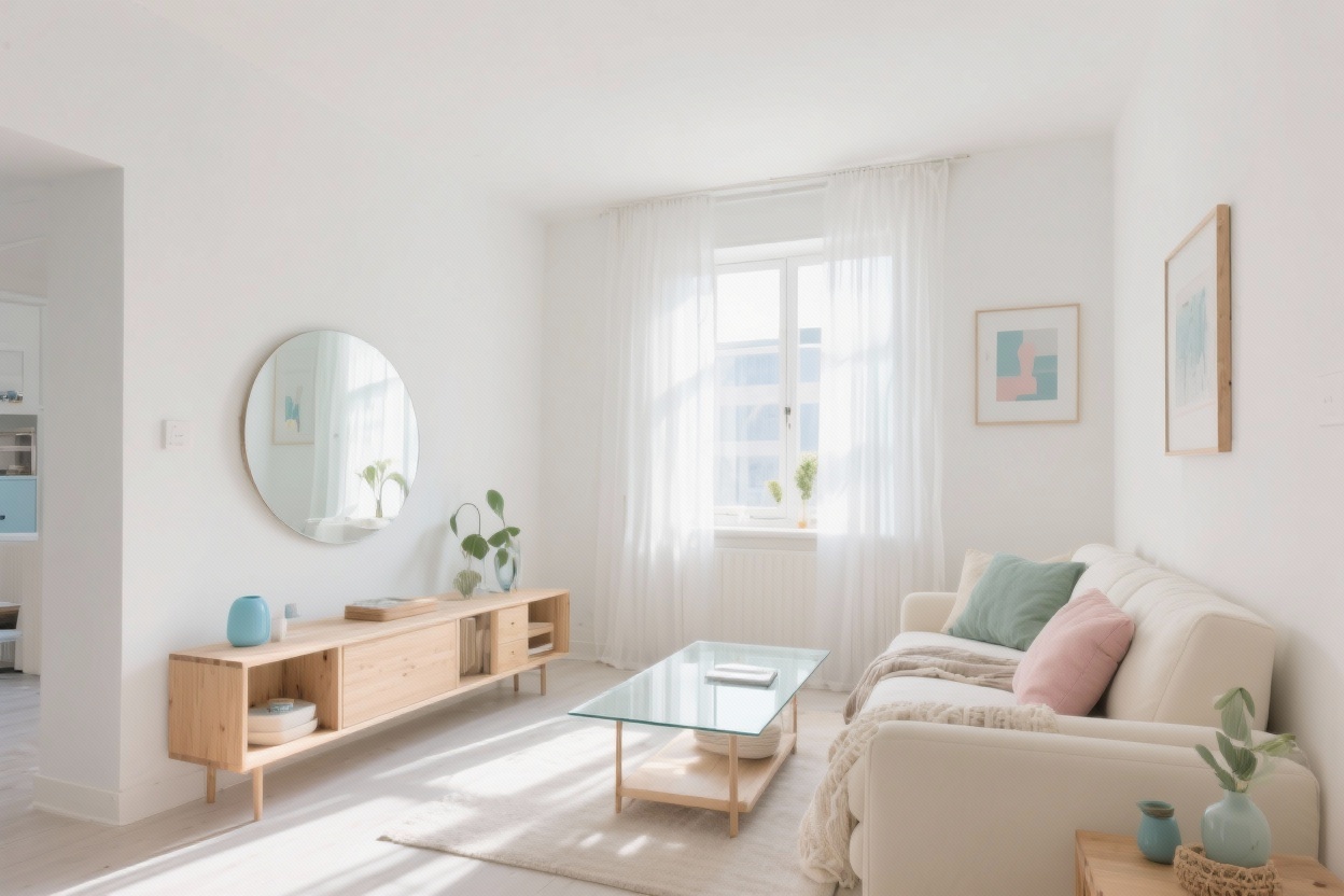 • Principle: Maintain Minimalism. Light ash wood consoles, white boucle stools.