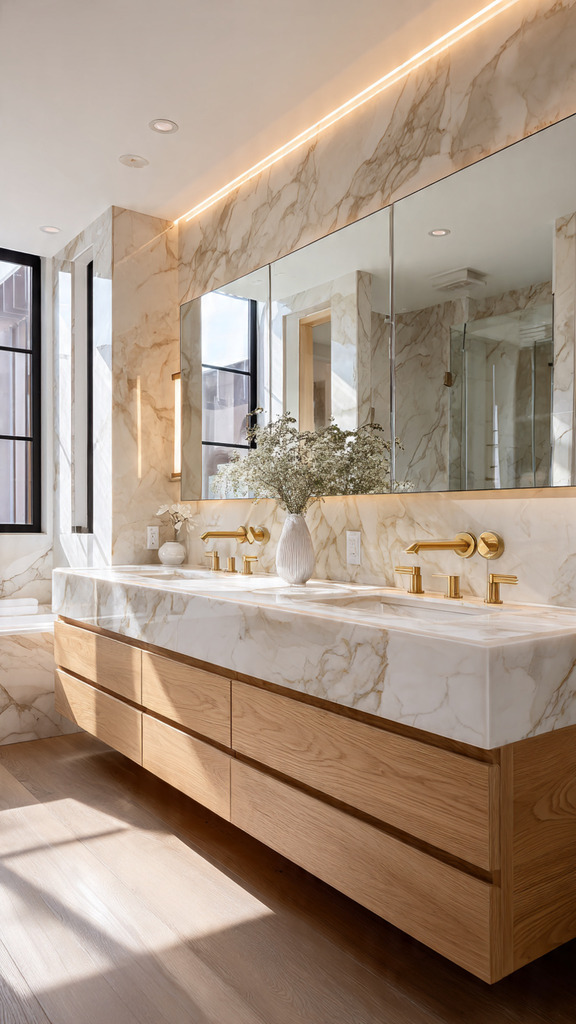 Experts recommend using floating, double vanities to open up the space. This design lets light move freely, making the room feel larger. It’s a perfect blend of modern style and functionality.