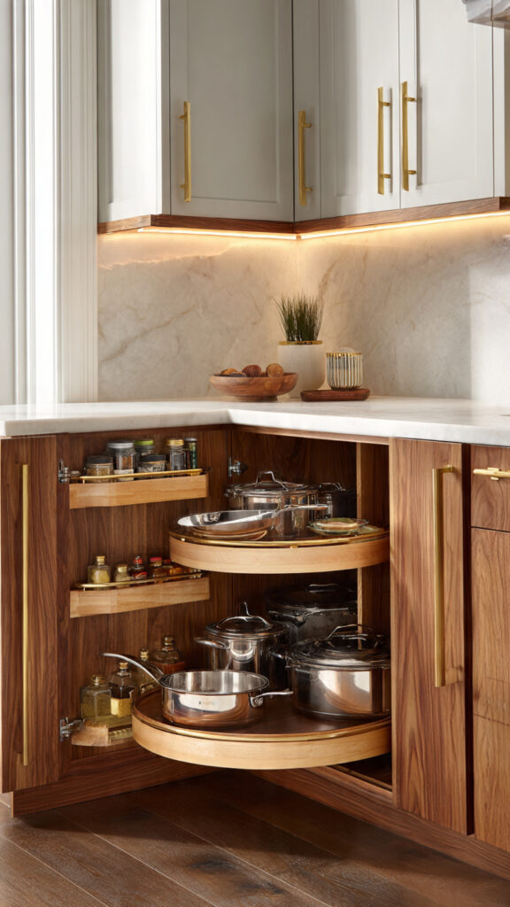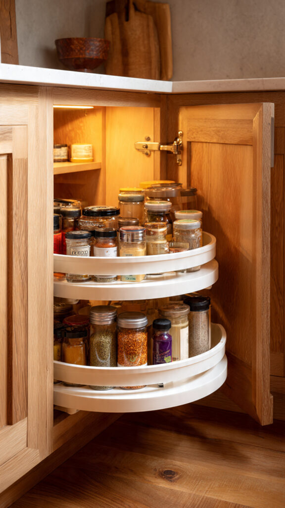 A Lazy Susan is a top choice for corner cabinet solutions in kitchens. It lets you reach items easily with just a spin. No more crawling into dark spots or stretching to get things.