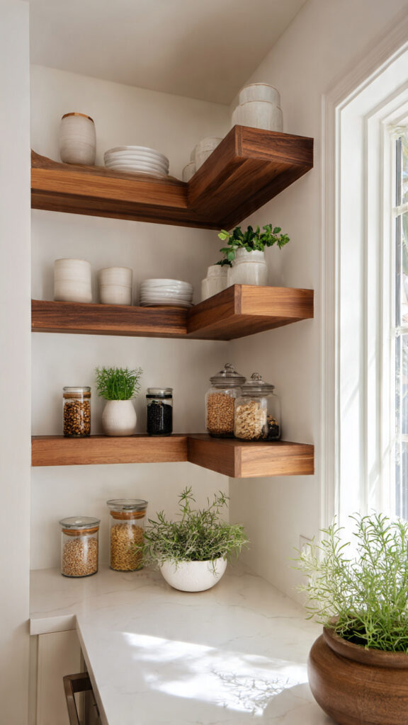 I want to show you a new way to use corner cabinet storage. Open shelving and floating corners turn dead space into a beautiful display. This style is perfect for a modern, open kitchen.