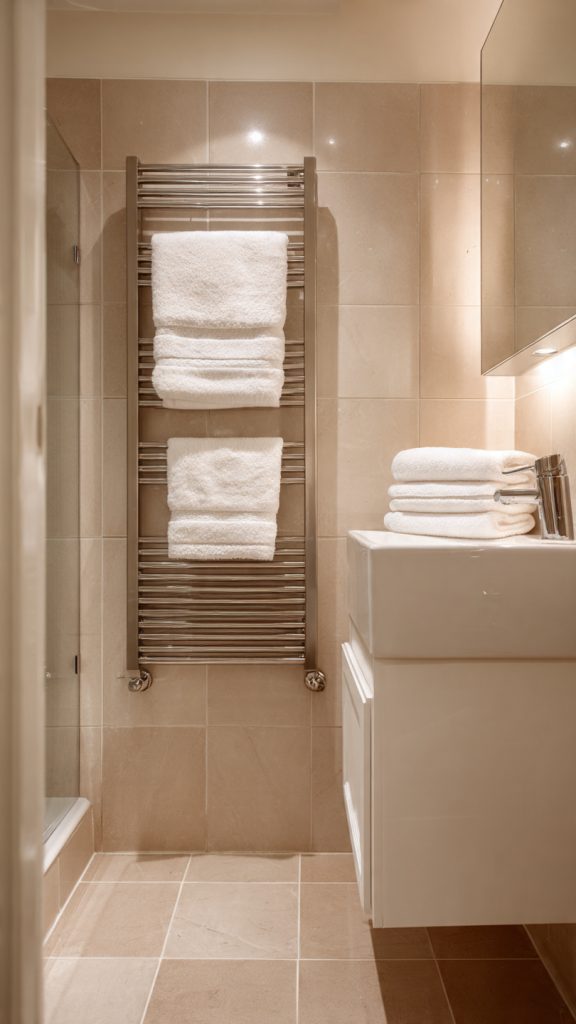 Towel warmers add extra warmth to the bathroom. When paired with underfloor heating, they make the space even cozier. This is especially true in colder climates or during winter.