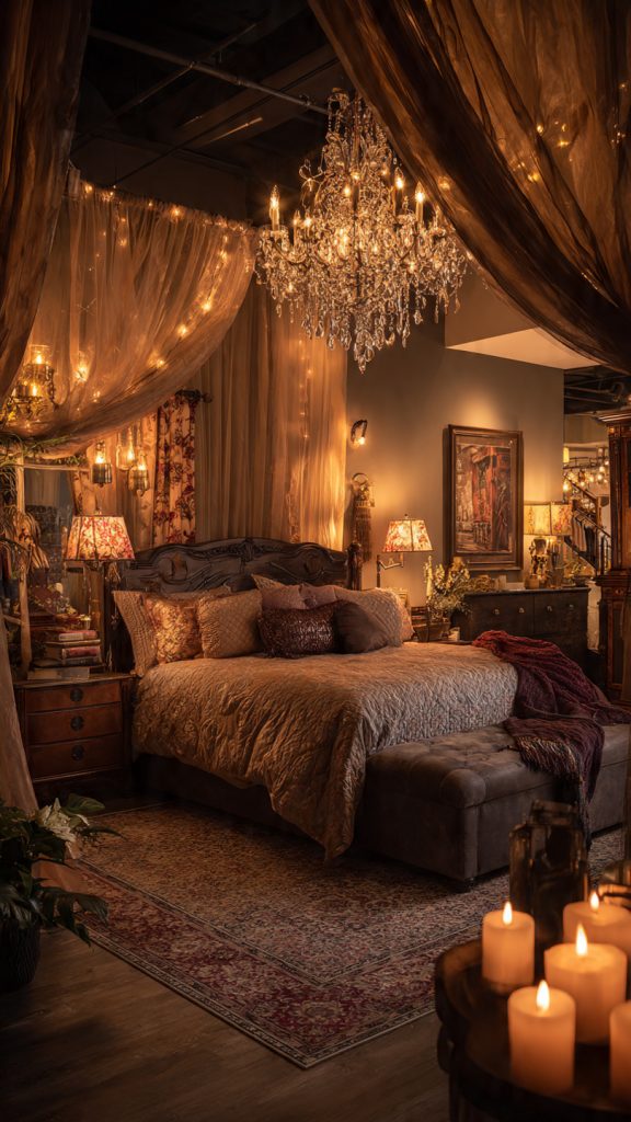 Warm-toned LED bulbs mimic old incandescent lights, perfect for vintage spaces. Dimmer switches let you change the mood anytime. For romance, string lights or fairy lights in a bed canopy create a magical feel.