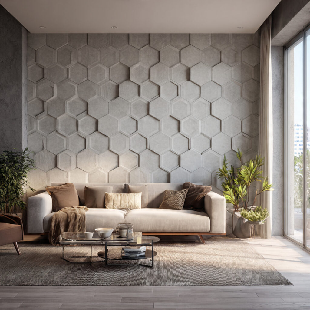 Using hexagonal 3D textured wall tiles is a great way to add depth to a living room. These tiles have a unique honeycomb pattern. This pattern adds visual interest and depth, making them perfect for modern spaces.