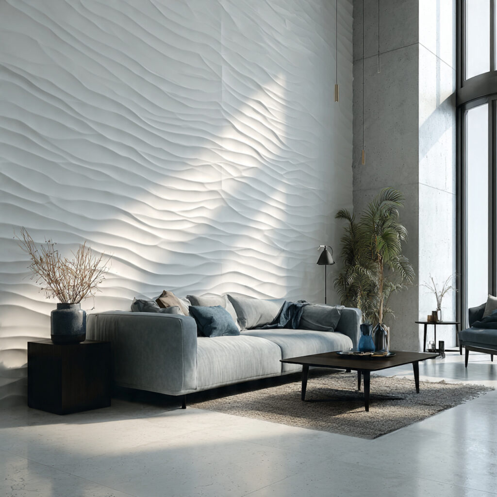 Geometric wave patterns are a striking way to use 3D textured wall tiles. These designs have undulating waves that add movement and energy. They make the living room more interesting and deep.