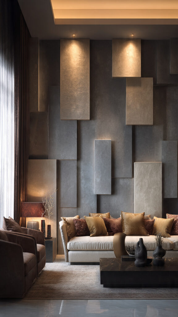 Using abstract sculptural tiles is a great way to make a bold statement wall. These tiles have intricate, three-dimensional designs. They can make your living room look amazing.