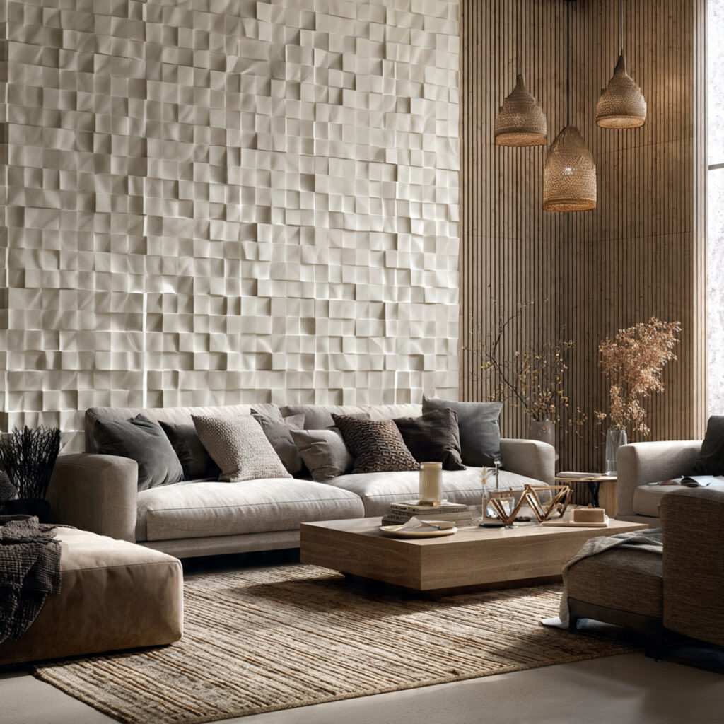 I’ve found that 3D textured wall tiles are amazing for living rooms. They add depth and make the room more interesting. Using textured wall panels can make a room look more stylish and sophisticated.
