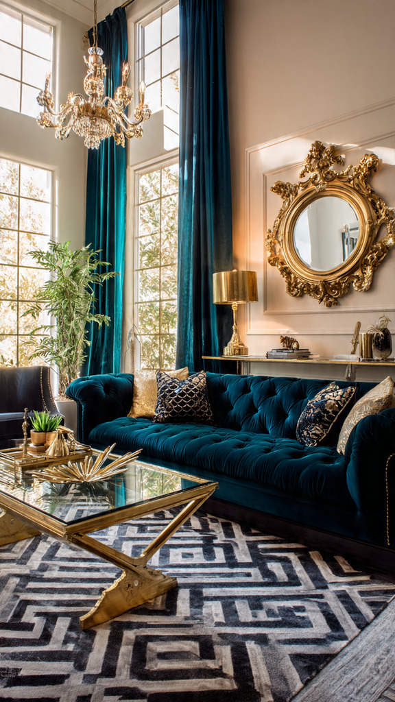 A lavish Classic Hollywood Regency Art Deco living room, showcasing bold geometric patterns and rich materials. In the foreground, an elegant velvet sofa in deep emerald green sits atop a plush, geometric-patterned area rug. A sleek marble coffee table with a polished brass frame complements the sophistication. In the middle ground, showcase floor-to-ceiling windows draped in sheer curtains, allowing soft, natural light to fill the room. The walls are adorned with intricate moldings and opulent mirrors that reflect the luxurious atmosphere. In the background, a stunning chandelier hovers elegantly, casting a warm glow. The overall mood exudes glamour and sophistication, with a tasteful color palette of gold, cream, and deep jewel tones. Aim for a sharp focus, showcasing the refined details, taken from a slight angle to provide depth and perspective.