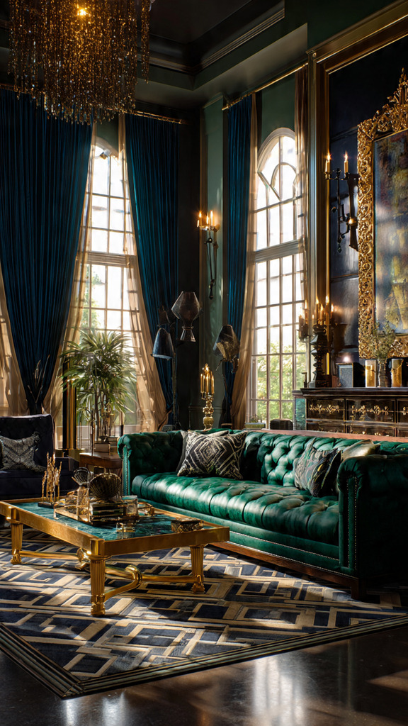 A luxurious Art Deco parlor featuring a palette of rich jewel tones such as emerald green, sapphire blue, and deep ruby red. In the foreground, a plush velvet sofa adorned with geometric patterns and elegant gold accents invites relaxation. An opulent coffee table, crafted from polished marble, sits center stage with ornate crystal decor. In the middle ground, a statement chandelier hangs gracefully from an intricately coffered ceiling, casting warm, ambient light that enhances the parlor’s richness. Elegant, framed mirrors and bold, stylized artworks line the walls, reflecting the sophistication of the era. The background showcases tall, arched windows draped with heavy, luxurious curtains, framing a view of a manicured garden. The atmosphere is one of warmth, elegance, and glamour, evoking a sense of refined luxury.