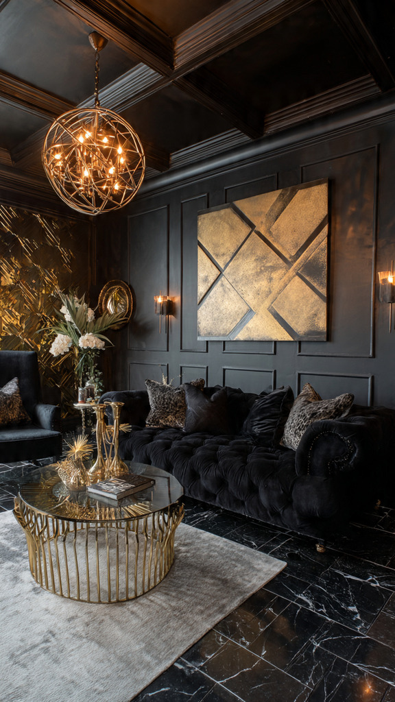 For a luxurious and dramatic living space, consider a black and gold color palette. This is a hallmark of Art Deco design. This bold and glamorous color combination can instantly elevate your living room, making it perfect for entertaining.