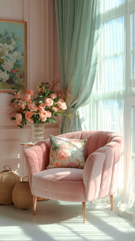 The Soft Deco style is known for soft colors, classic furniture, and vintage designs. It uses pastel shades like pale pink, baby blue, and mint green for a calming feel. The flowing lines and delicate patterns make the space elegant.