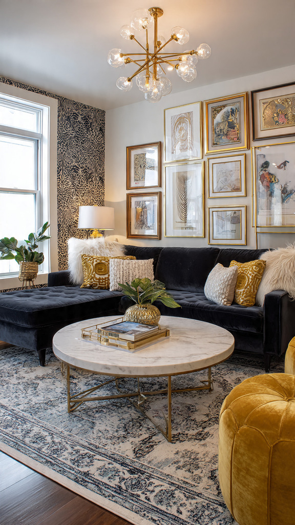 While black and gold can create a dramatic and luxurious atmosphere, balancing these bold colors is crucial. Start by using black for larger furniture pieces, such as a sofa or coffee table. Then, incorporate gold through accent pieces like lighting fixtures, vases, or picture frames.