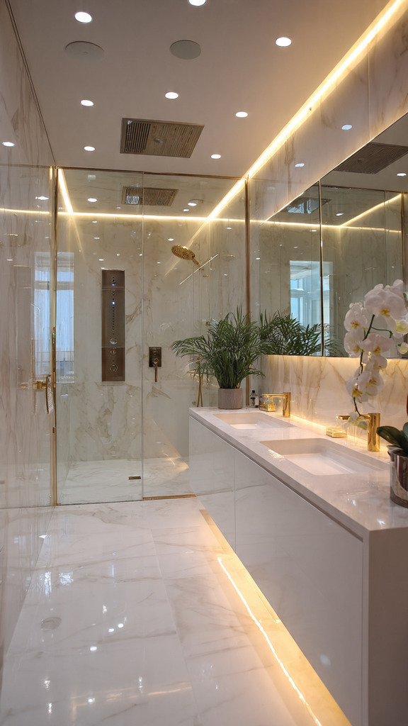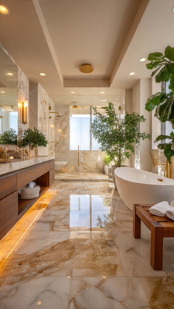 A boutique hotel-inspired wet room featuring a spacious, luxurious design. In the foreground, polished stone tiles with elegant grays and whites create a seamless floor area, leading to a modern, glass-enclosed shower with rainfall showerhead. The middle section showcases a sleek, freestanding soaking tub, surrounded by lush greenery for a spa-like atmosphere. Soft, warm ambient lighting illuminates the room, enhanced by strategically placed LED lights under floating wooden shelves displaying neatly arranged towels and decorative items. The background features an oversized mirror that reflects the serene, tranquil ambiance. The overall mood is serene and elegant, exuding sophistication ideal for a high-end hotel experience.