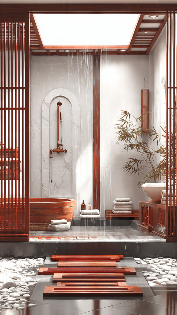 A serene Japanese-inspired wet room design, featuring smooth, natural stone tiles and warm wooden accents. In the foreground, a minimalist, freestanding soaking tub sits next to a sleek bamboo ladder adorned with fluffy towels. The middle section showcases a spacious, glass-enclosed rain shower with soft, cascading water and an overhead skylight that allows natural light to fill the space. In the background, delicate Japanese shoji screens create a peaceful ambiance, while integrated plants like bamboo and ferns enhance the sense of tranquility. The lighting is soft and diffused, creating a calming atmosphere conducive to relaxation. Capture the scene from a slightly elevated angle, emphasizing the harmonious blend of nature and modern design elements.
