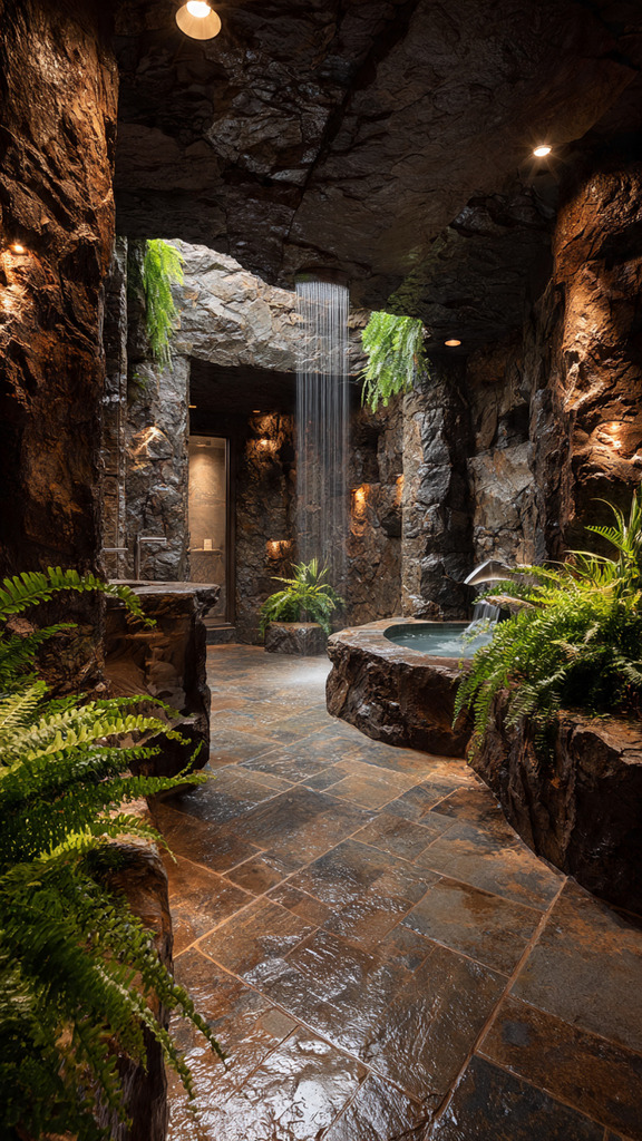 A luxurious wet room featuring a natural stone grotto, with walls adorned in various textures of rich, earthy stones like travertine and granite. The foreground showcases a beautifully crafted stone shower with cascading water that mimics a tranquil waterfall, surrounded by lush greenery peeking through rock formations. In the middle, a sleek, modern glass partition adds an elegant touch, reflecting soft ambient lighting that creates a warm and inviting atmosphere. The background is a subtle blend of natural light filtering in through skylights, illuminating the stone features and enhancing the serene environment. The overall mood is one of relaxation and luxury, perfect for an upscale bathroom design.