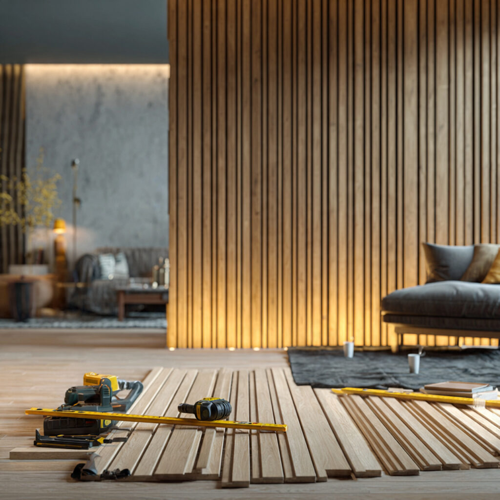 Before starting, prepare your tools and the wall. You’ll need a miter saw, level, tape measure, and a nail gun. Also, a moisture meter and construction adhesive are key. Make sure the wood acclimates to the room’s conditions.