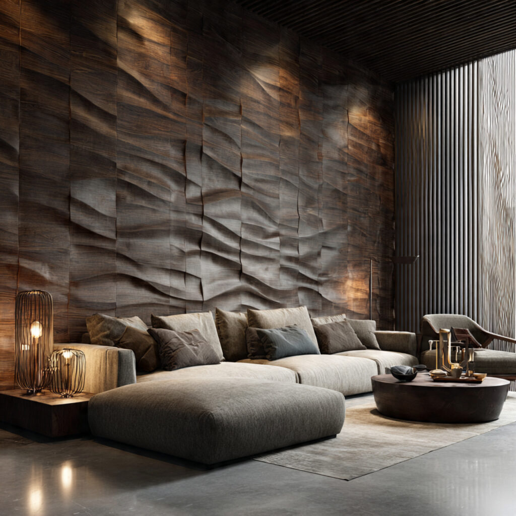 Textured and 3D panels add depth without clutter. They’re best in minimalist rooms. Here, light and shadow play across the surfaces.