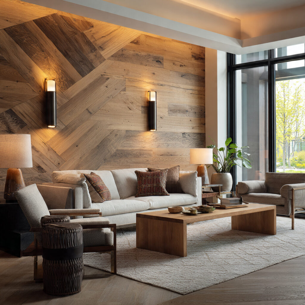 Geometric wood paneling looks like art and architecture. A chevron wood wall or herringbone field adds a modern touch to a living room. It keeps the room warm and textured.