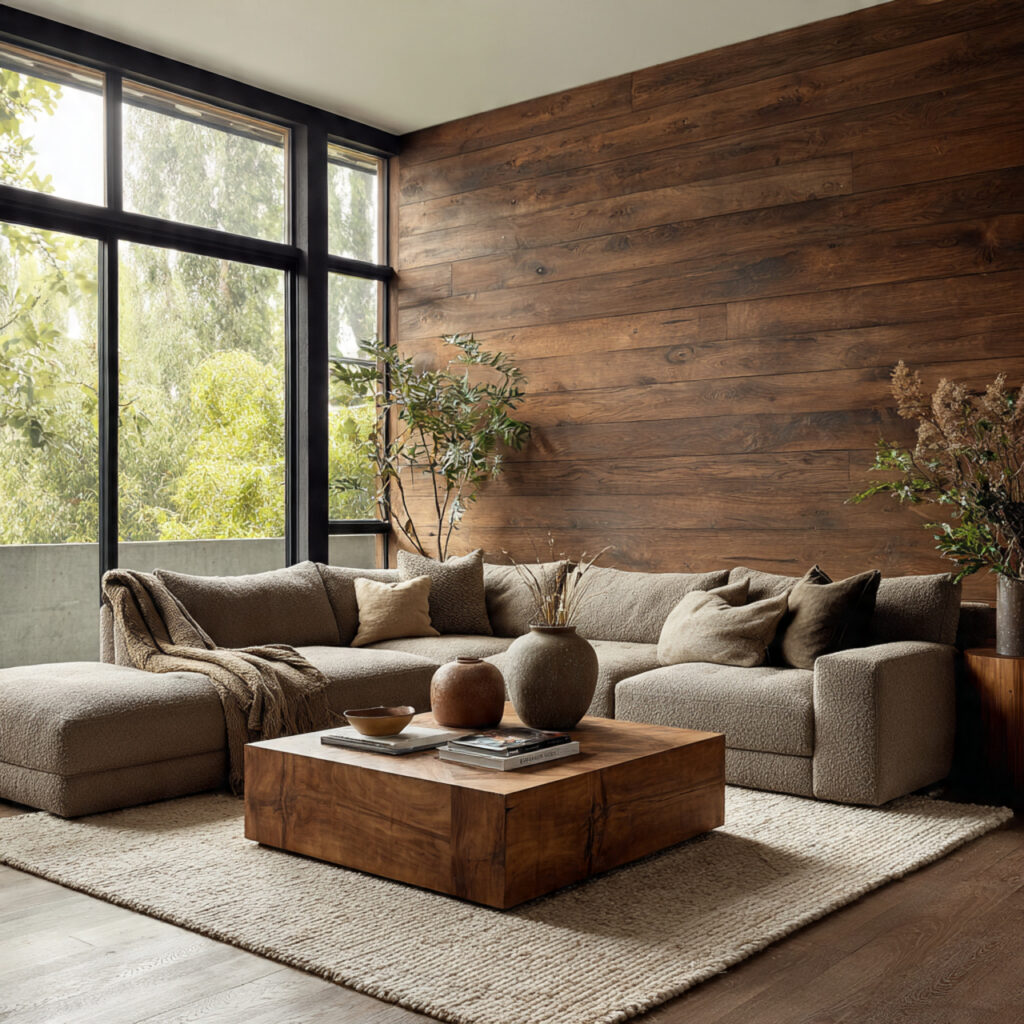 Wood wall paneling adds warmth and texture that paint can’t match. The grain and natural tones make a wall stand out. They turn a simple wall into a key feature that frames seating or a fireplace.