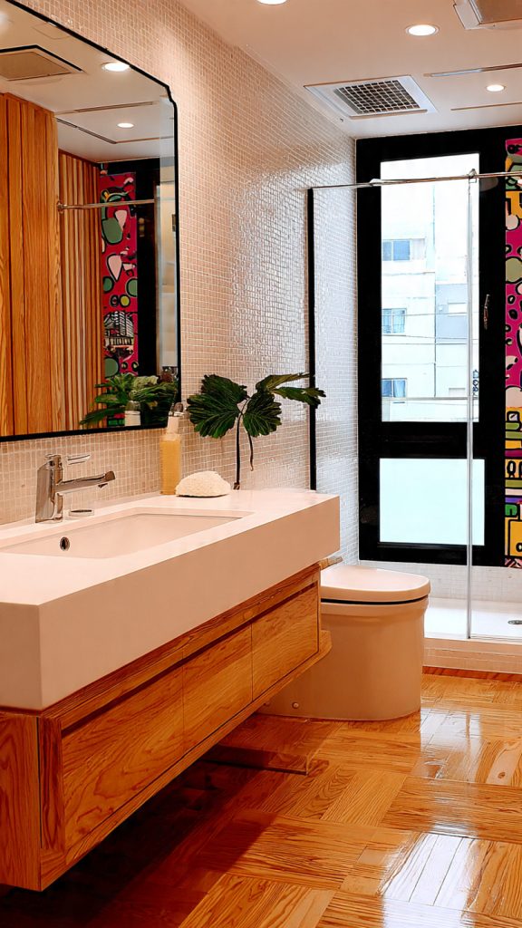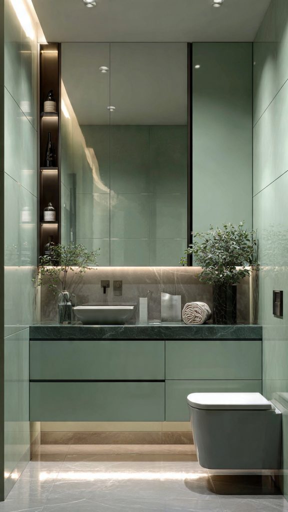 To truly embrace this small bathroom color scheme, add color vertically. Use living walls, vertical gardens, or hanging planters. This trick makes the space feel taller and more open.