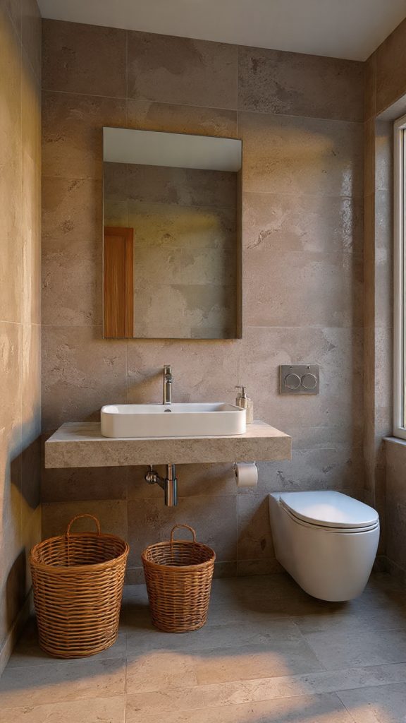 Introduce natural textures like woven baskets and wooden stools. Add warmth with wood-toned accessories. Even a bathroom rug with texture can make a big difference.