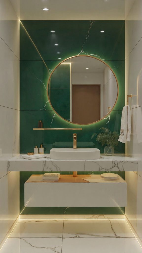 Try a bold, patterned cement tile in the shower niche, or a stunning backsplash above a floating vanity. Let the tile and your bold paint color have a conversation. For example, a deep emerald green accent wall can be complemented by a mosaic tile in the shower niche.