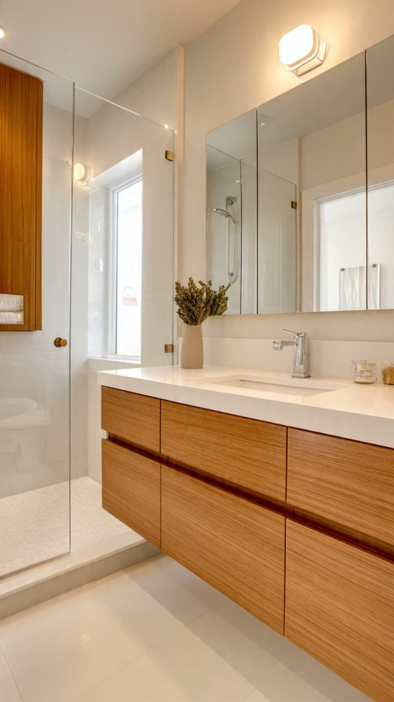 Play with texture to add depth. Use matte walls, glossy vanity, and honed stone surfaces. This creates a spa-like atmosphere that’s both cohesive and calming.