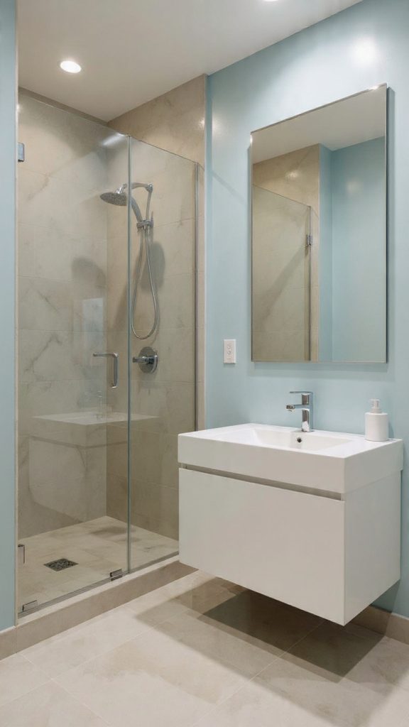 Light, reflective paint colors like soft neutrals or serene blues can make walls look bigger. Combine these with smart layouts, like a floating vanity or a glass shower. This opens up the floor and lets light in. Vertical storage and clever layouts, like a wet room, can make every inch count.