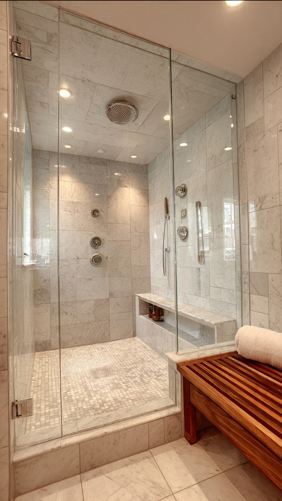 To relax more in your walk-in rain shower, add some luxury features. A large showerhead that feels like rain is key. It makes your shower a soothing experience.