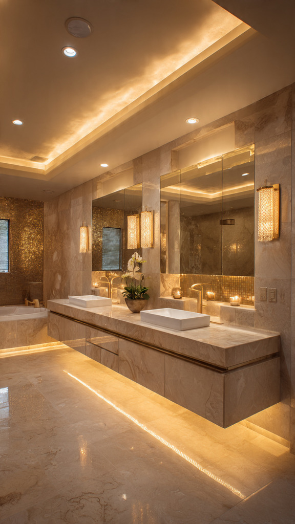 A layered lighting scheme mixes different lights for a balanced look. It includes overhead lights, task lights by the vanity, and accent lights for design highlights.