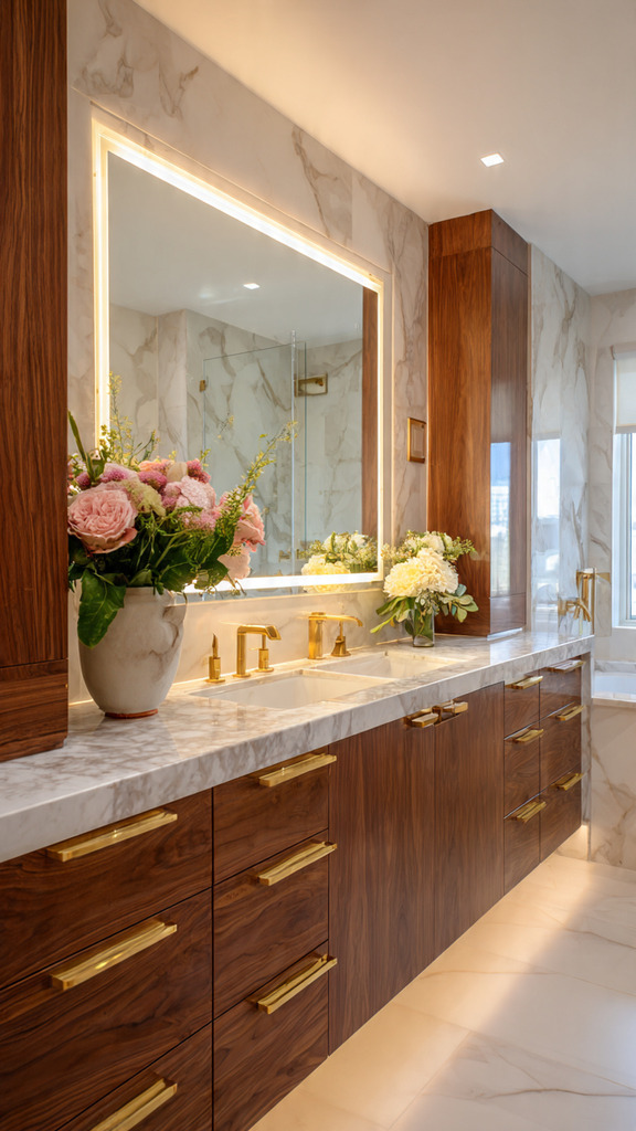 Wood accents: Wooden vanities, cabinets, or wall panels add warmth and texture.