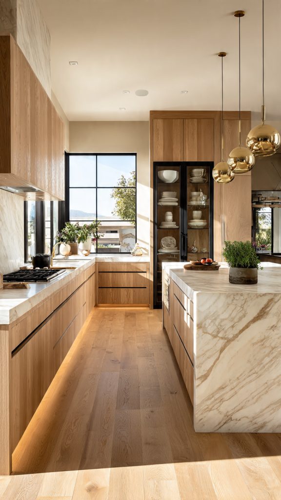 The glass panels contrast beautifully with the wood grain. This makes the kitchen look bigger and more open. It lets you see beyond the cabinets, adding depth.