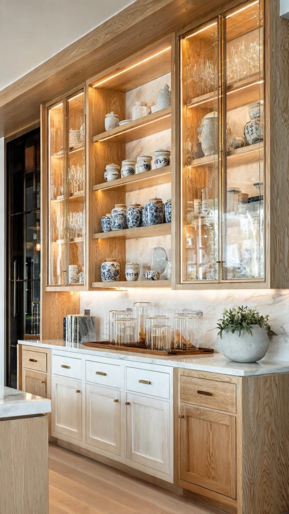 Using white oak cabinets with glass panels balances style and function. It makes your kitchen look better while still being practical.