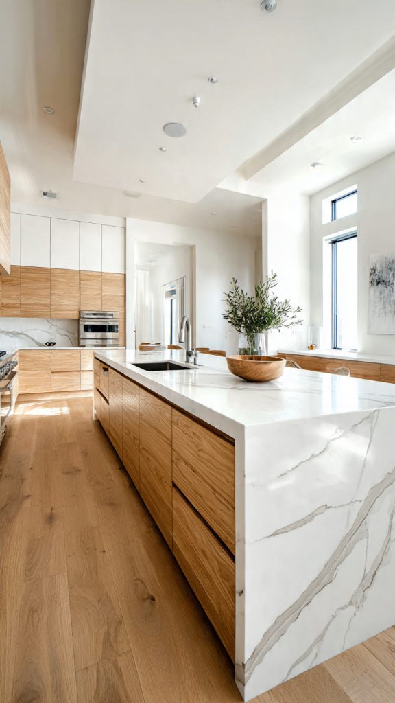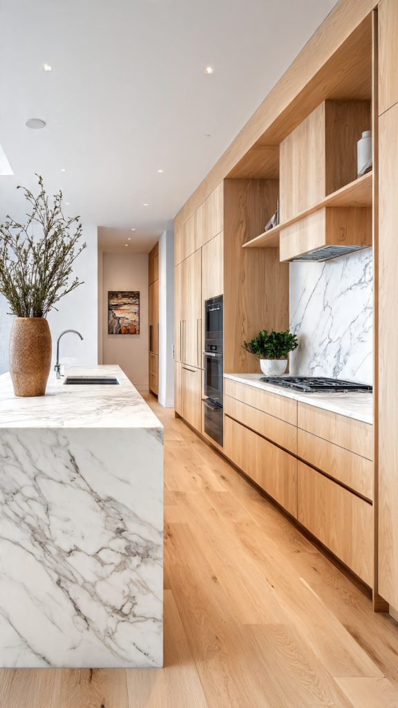 Stylish white oak cabinets make this balance easy. They add a soft, natural touch that contrasts with modern lines. This creates a warm spot in your home where family stories are shared.