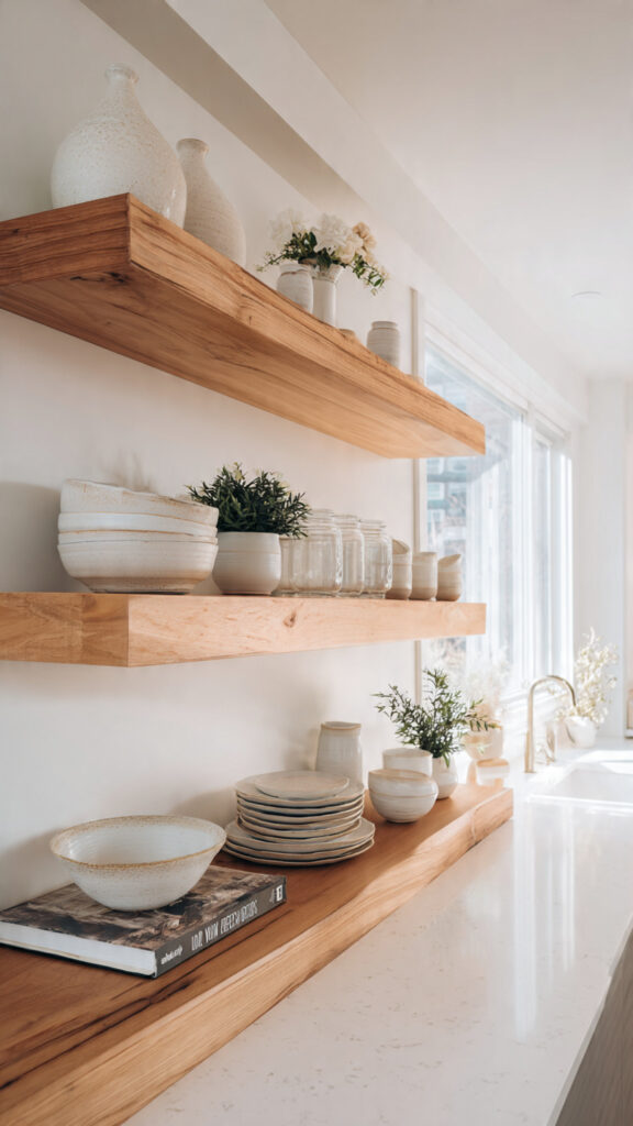 Styling these shelves is key. Let the wood be the star. Choose a color palette for your dishware like white or soft earth tones. Group items in odd numbers for interest.