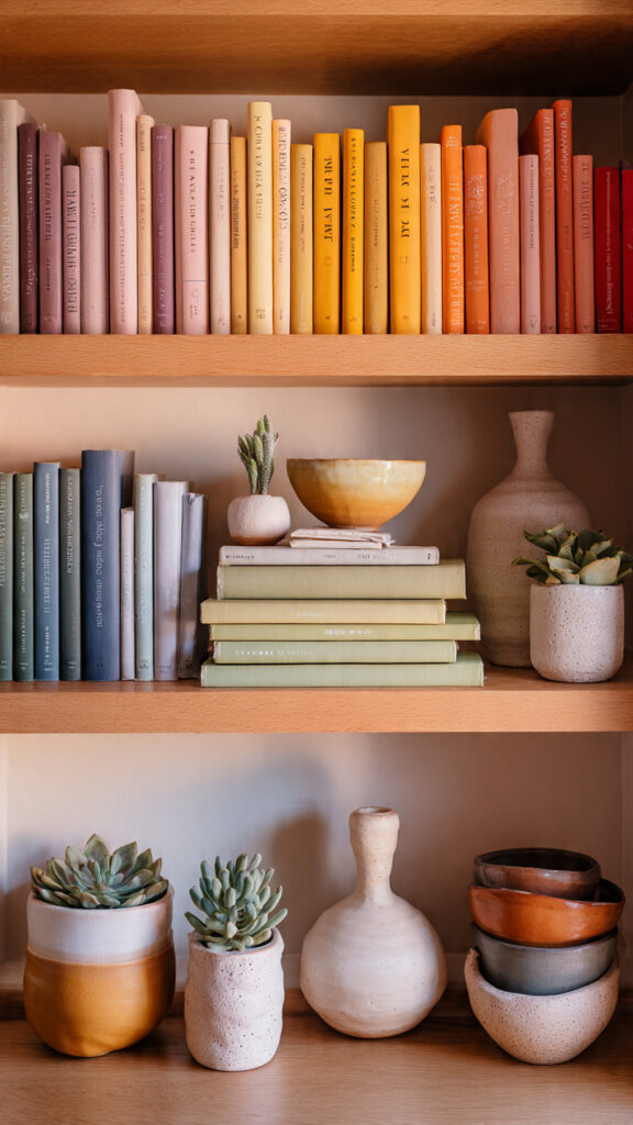 To add variety, I include small decorative items. A tiny succulent or a handmade bowl works well. These elements add texture and a natural touch. They make the shelf feel curated, not just filled.
