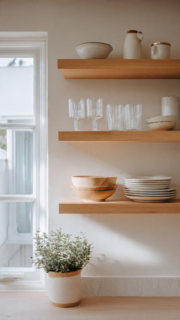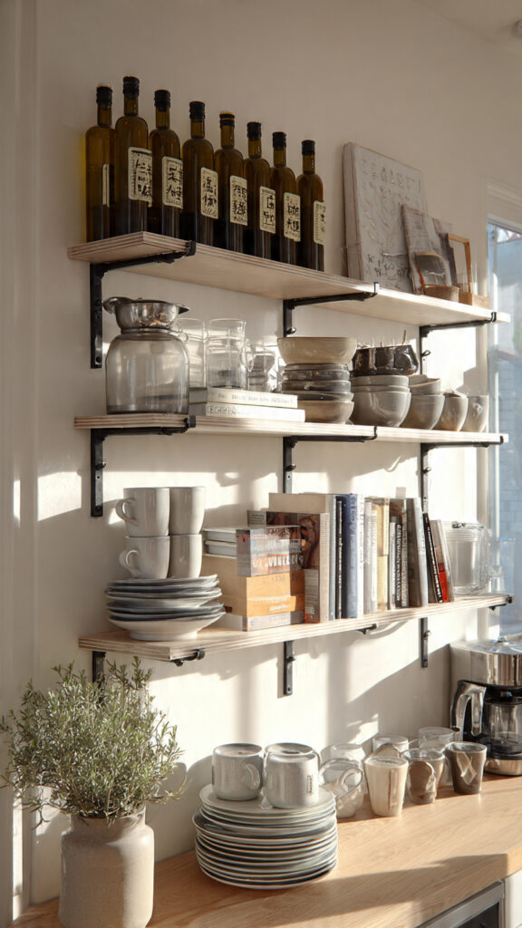 A neutral backdrop is your best friend. White, cream, or soft gray walls let your dishes, glassware, and plants become the stars. Your shelves become a stage, not the main performance. This setup is incredibly forgiving.