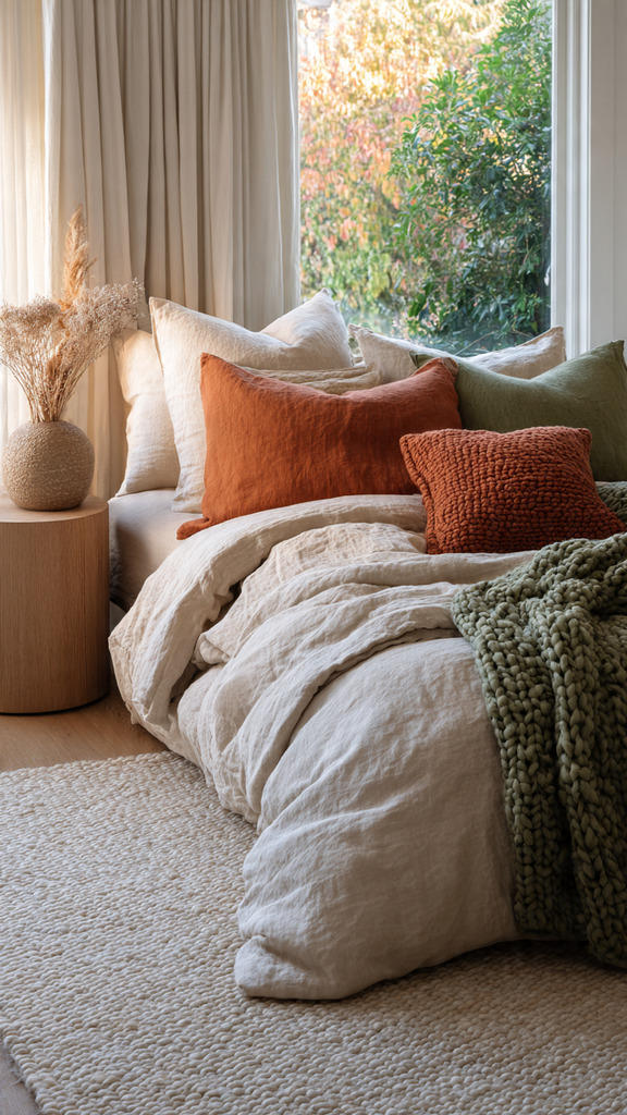 A serene bedroom showcasing a cozy ambiance layered with organic textures. In the foreground, a plush linen bed adorned with soft earth-toned throw blankets and a collection of textured pillows creates an inviting focal point. The middle ground features a wooden nightstand with a handcrafted ceramic lamp casting soft, warm light. The background reveals a wall with natural fiber wallpaper and potted plants that add a touch of greenery. A large window allows gentle daylight to filter in, creating dappled lighting throughout the space. The overall atmosphere reflects a tranquil retreat, emphasizing tactile comfort and earthy luxury, with a focus on warm hues and natural materials.