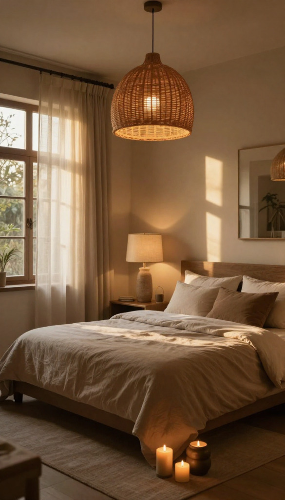 I use a layered lighting approach. A pendant with a rattan or paper shade adds organic texture to the ceiling. For reading, I use lamps with linen drum shades.