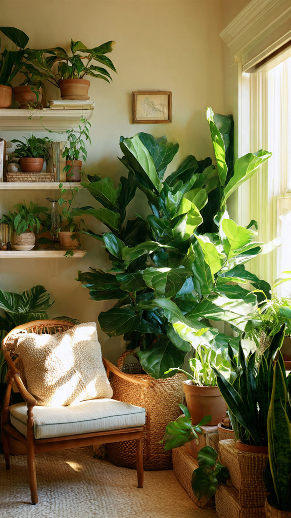 Next, add life with plants. Choose ones that are easy to care for and clean the air. A snake plant, a pothos, or a fiddle-leaf fig are great picks. They make your room lively and healthy.