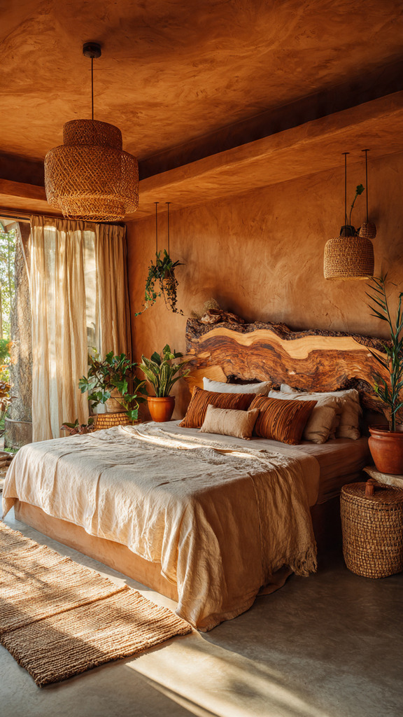 A serene bedroom interior designed with raw, natural materials. In the foreground, a plush, earthy-toned bed is draped in organic cotton linens, surrounded by rustic wooden nightstands. The middle ground features textured walls made of reclaimed wood and stone, showcasing a harmonious blend of nature. A cozy area rug made from jute adds warmth underfoot. In the background, large windows allow soft, natural light to flood the space, casting gentle shadows and highlighting the organic textures. Lush green plants in woven baskets create a refreshing contrast against the earthy palette. The atmosphere is tranquil and inviting, promoting a sense of retreat and relaxation, with an emphasis on earthy luxury and sustainability.