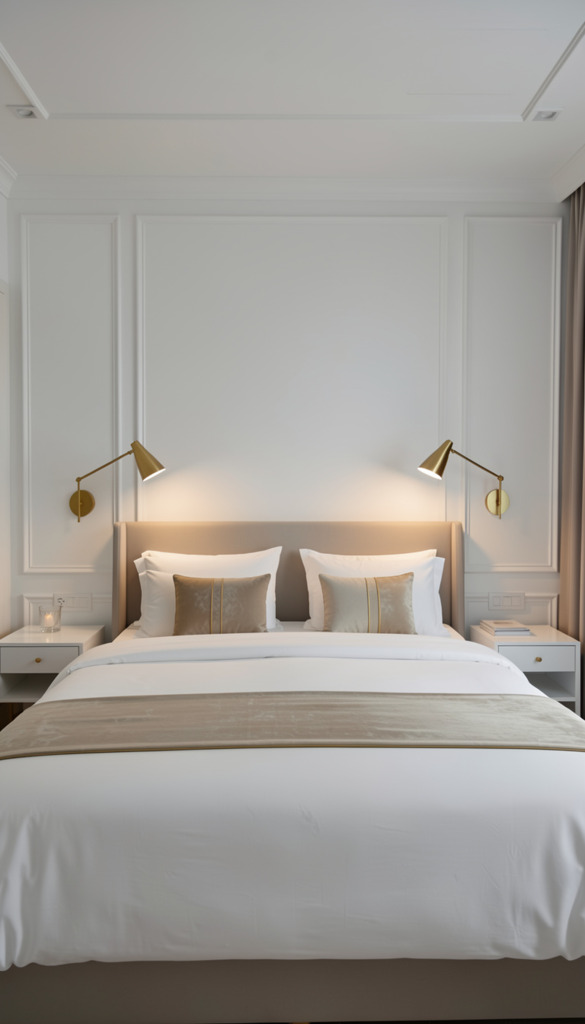 A beautifully designed bedroom featuring headboard-mounted reading lights with individual controls. In the foreground, the focus is on two sleek, modern reading lights gracefully attached to a stylish wooden headboard, each with its own adjustable arm, illuminating softly. The middle ground showcases a cozy, neatly made bed with plush pillows and a light, inviting bedspread. In the background, a softly lit bedside table holds a few books and a decorative plant, creating a serene atmosphere. The lighting is warm and inviting, casting gentle shadows that enhance the tranquil mood of the scene. The composition is shot at a slight angle, highlighting the functionality and aesthetic appeal of the reading lights, set against a relaxing, softly colored wall.