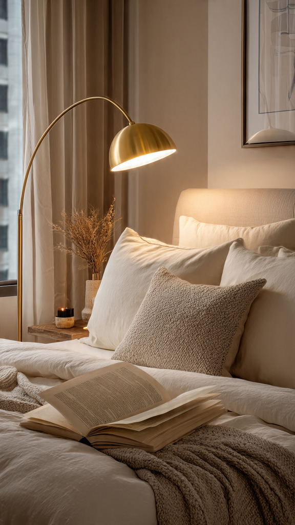 A cozy bedroom scene showcasing optimal reading light placement. In the foreground, a stylish reading light mounted on a bedside table, angled away from a sleeping area, emits a warm, soft glow, illuminating an open book. The middle section features a comfortable bed with plush pillows neatly arranged, emphasizing a serene sleep zone. The background features a softly lit window with sheer curtains, allowing gentle daylight to filter in, creating a calming atmosphere. The overall mood is tranquil and inviting, with a focus on creating the perfect reading environment without disturbing a partner. The scene should capture the essence of peaceful coexistence in shared spaces with no visible people.